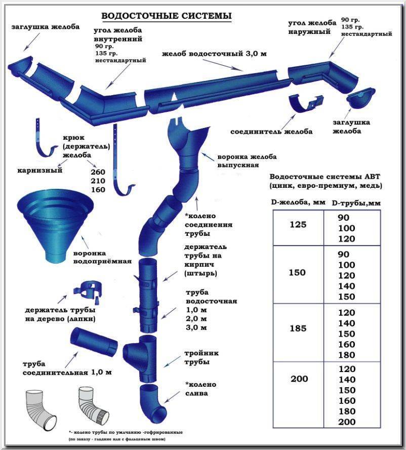 Что касается водосточных труб, кронштейнов и прочей фурнитуры, то обычно в магазинах это все идет в комплекте. Вы говорите ширину желоба и вам подбирают под неё всю систему. При подборе фурнитуры трубы желательно брать с большим диаметром, так меньше вероятность засора.