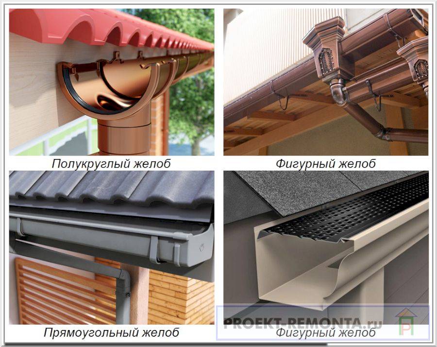 По форме водоотливы кровли бывают полукруглыми, прямоугольными и фигурными. Строго прямоугольные желоба, прямо скажем, на любителя. Их фигурные собратья выглядят оригинально, но обходятся на порядок дороже.