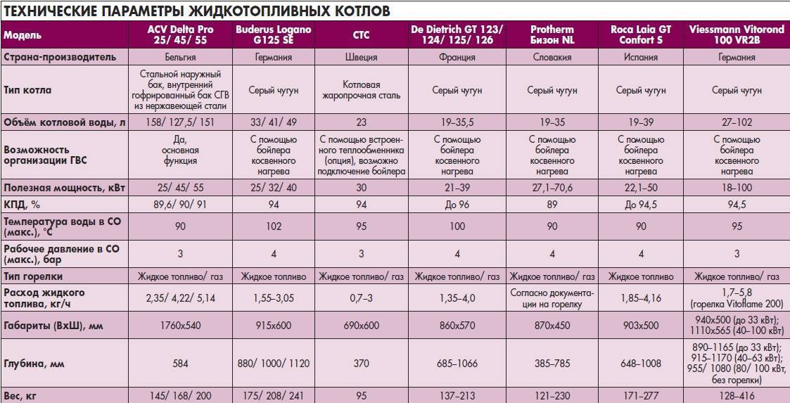 Ок, поехали дальше. Смотрим на разные показатели по мощности жидкотопливных котлов и их расход.