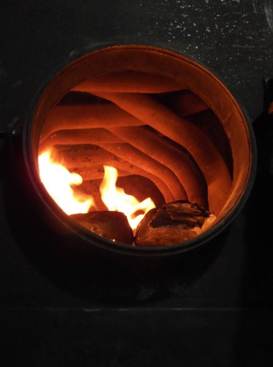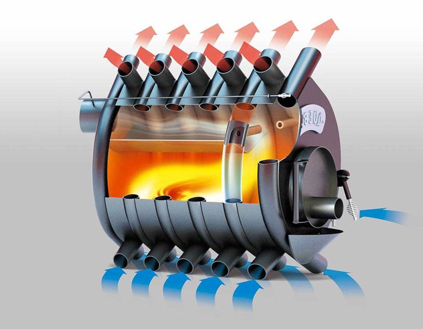 Раскаленные под действием огня газы отдают тепловую энергию (до 90%) в изогнутые трубы конструкции. Если правильно рассчитать мощность печи и площадь обогреваемого ею помещения, то подкладывать топливо потребуется 2-3 раза в сутки.