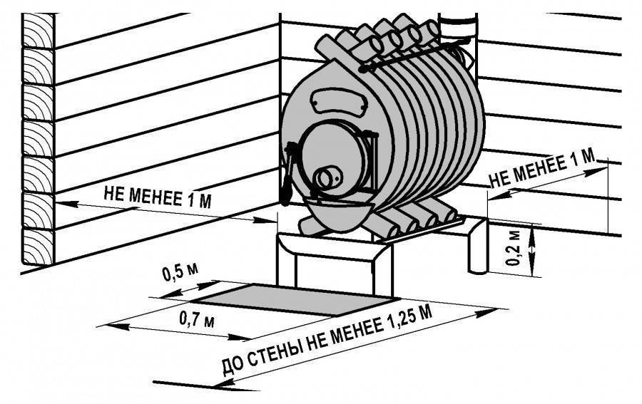 Когда выполняется установка «Булерьяна», необходимо соблюдать расстояние от нагревательного агрегата до стен согласно рекомендациям относительно противопожарных требований в зависимости от материалов.