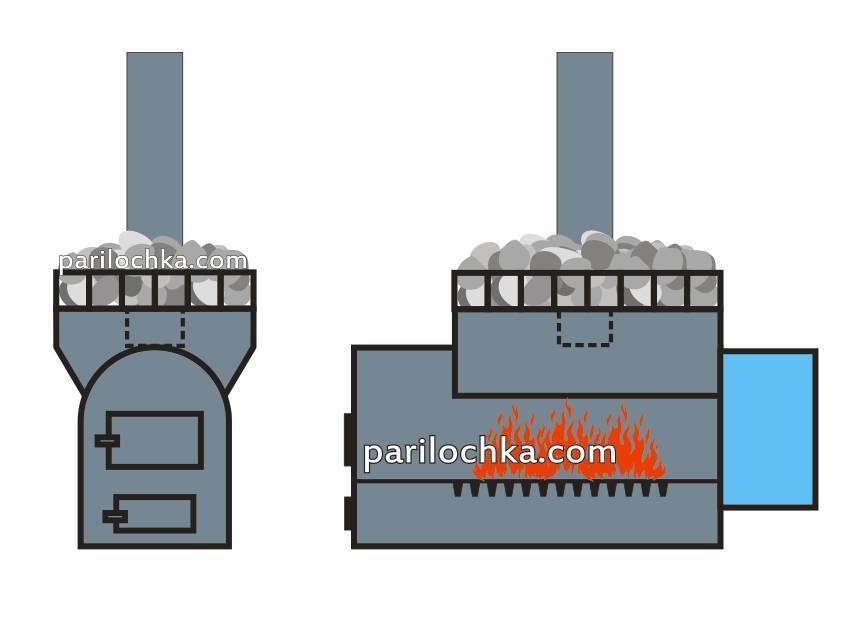 Поэтому простейшая каменка из металла будет представлять собой ящик с колосниковой решеткой внутри, отделяющей поддувало от топливника. Каменка расположится над топкой или сбоку от нее, так же может быть расположен бак для воды.