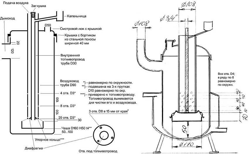Все вышесказанное в равной степени относится к буржуйкам на отработанном масле. Единственное отличие – размещение топливной емкости, питающей капельницу. Держите бак подальше от печки, чтобы случилось возгорания. Обычный двухкамерный чудо-отопитель не используйте – он пожароопасен и расходует до 2 литров отработки за 1 час. Пользуйтесь моделями с капельной горелкой.