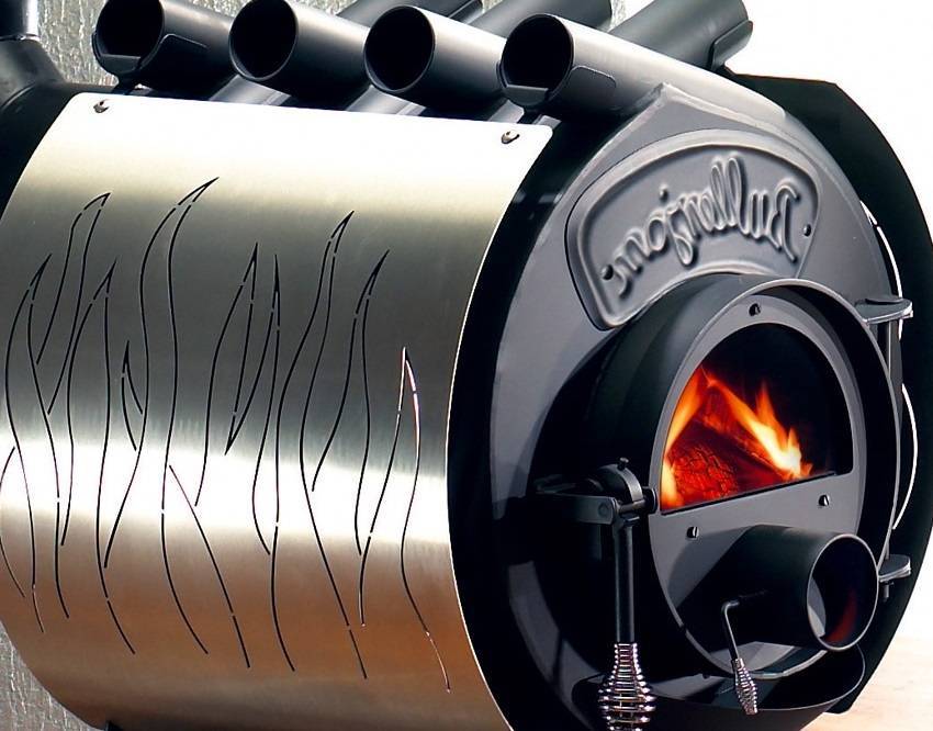 Булерьян – также популярная модель печи длительного горения, ее конструкция очень необычная. Устройство широко используют не только для служебных, но и для жилых помещений. Это своего рода современный гибрид классической буржуйки и печки длительного горения. Агрегат работает за счет принудительной конвекции. К топке снизу и сверху идет несколько изогнутых труб. Через нижние поступает холодный воздух, который моментально нагревается в топке и сверху выходит уже горячим.