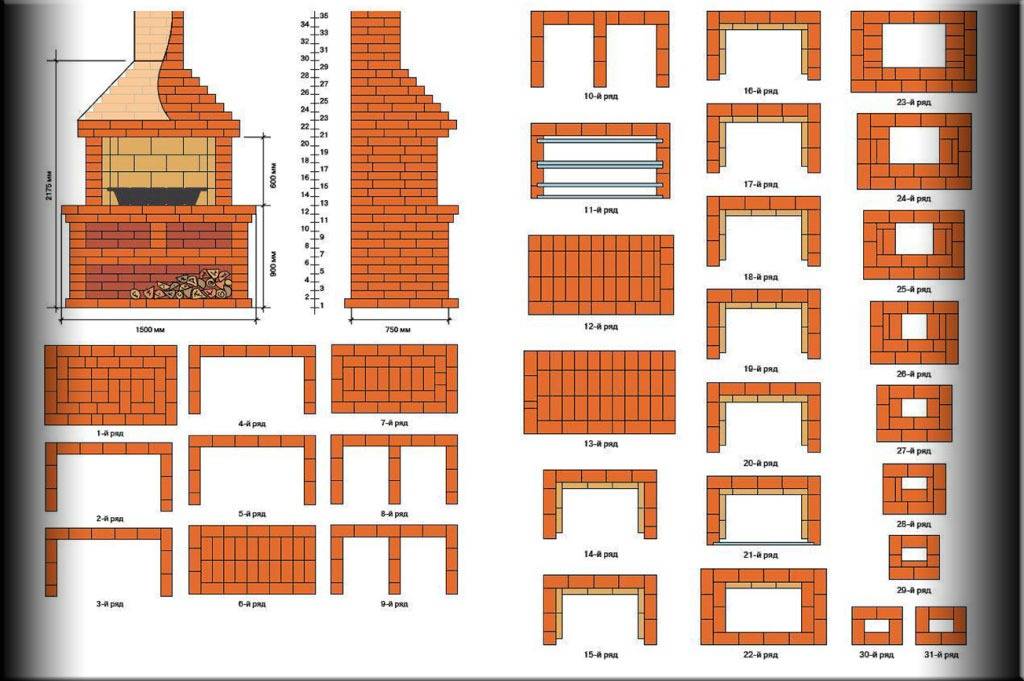 Для более сложных конструкций на основе схемы разрабатывают подробный проект, где учитываются все нюансы. Для кладки барбекю из кирпича своими руками составляют порядовки мангала – схемы укладки кирпича в каждом ряду.