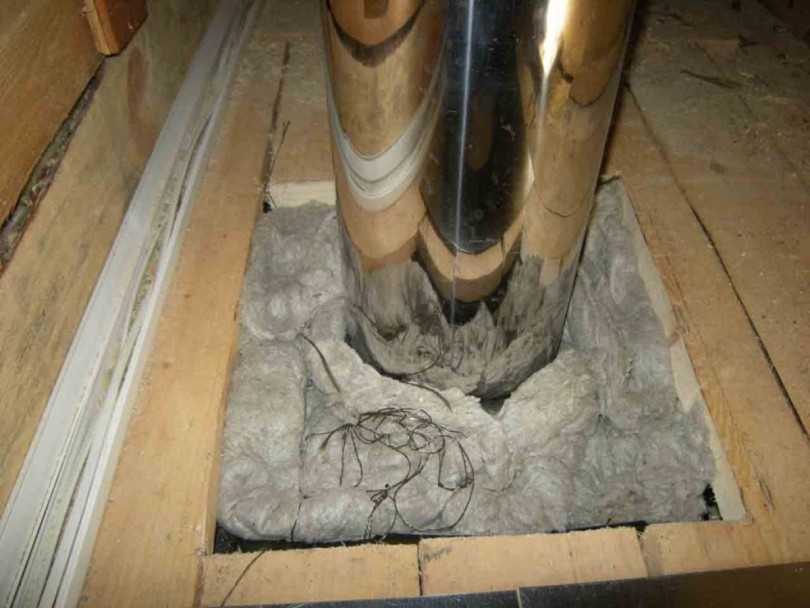 - Прокладка дымохода. Наружная часть трубы должна быть утеплена, лучше всего выложить кирпичный кожух. Саму трубу камина необходимо надежно защитить термостойким материалом от соприкосновения с деревянными частями перекрытий и стен.