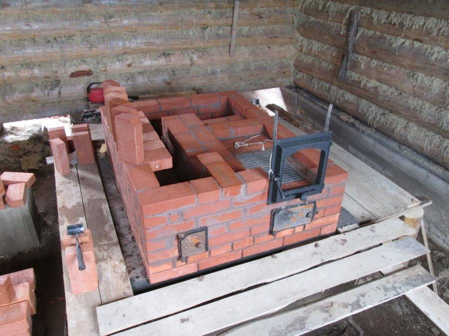 Рубленая сторона кирпича должна находиться внутри кладки. Это правило, также используют при сооружении дымовых путей. Дымоход выстраивают из красного обожженного кирпича. А отверстие топки создается при помощи металлического угла, “замковой” выкладкой.