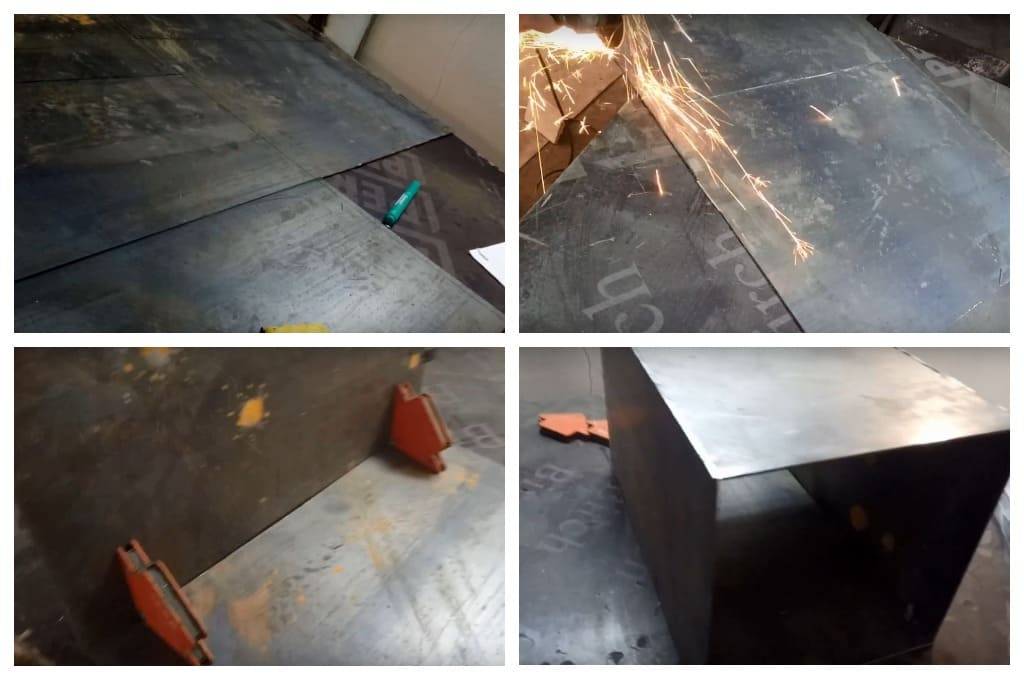 - Листовую сталь раскладываем на ровной поверхности, делаем разметку и производим резку деталей болгаркой. На листогибочном станке производим гибку, подготавливая детали – стенки резервуаров. Проверяем плотность прилегания деталей.