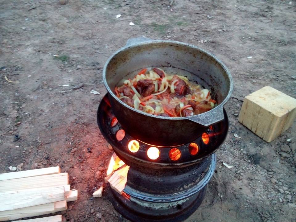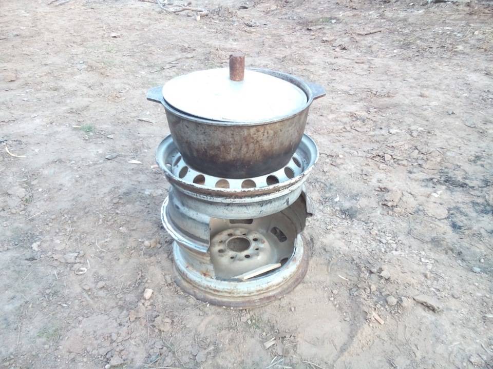 При этом способе вся конструкция становится разъемной, жесткие соединения отсутствуют. Добиться этого можно раздачей наружного обода одного колеса и осадкой другого – результатом станет плотное стыковое соединение. Операция осуществляется с помощью молотка. В нижнем диске вырезается технологическое отверстие для загрузки топлива. При таком варианте изготовления показатели печи ухудшаются: она станет «прожорливой», теплоотдача снизится. Чтобы в полной мере сохранить эксплуатационные характеристики, боковое отверстие можно не вырезать. Дрова будут загружаться через верхний вырез, но для этого придется каждый раз снимать казан.