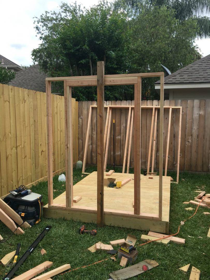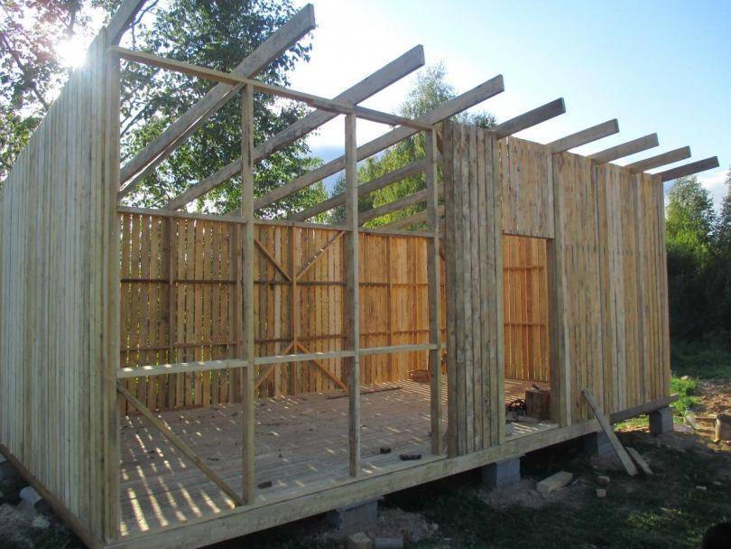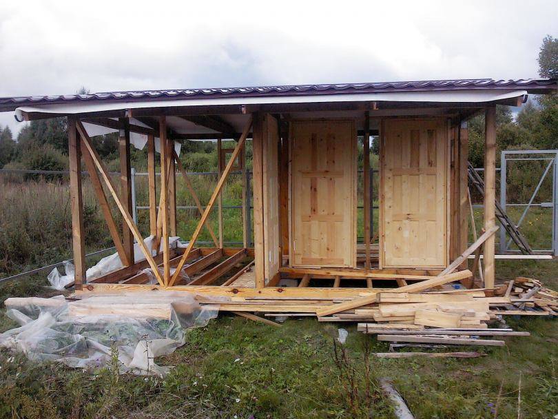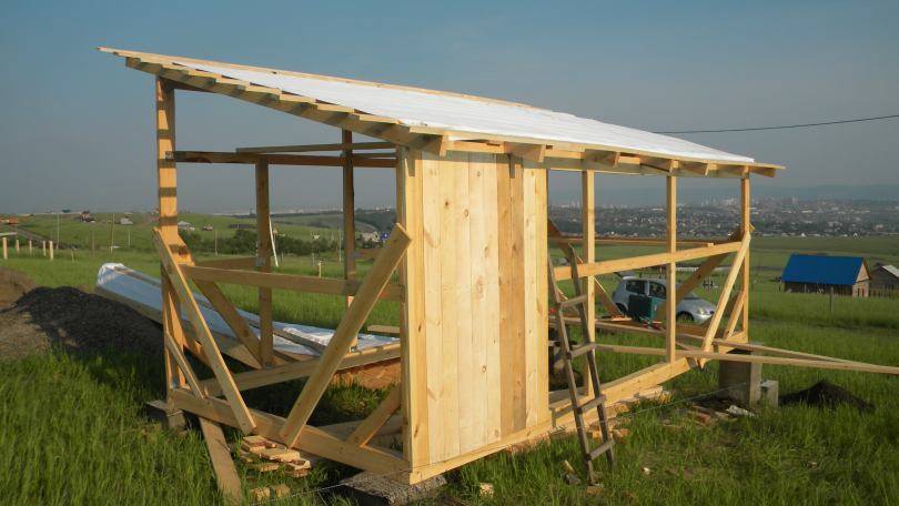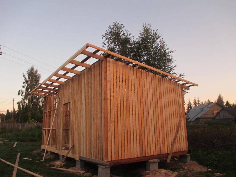 Обшивка, кстати, не обязательно должна быть из фанеры или ОСП. Можно вагонку или доску крепить сразу а стойки. Но тогда при сборке каркаса нужно ставить укосы: без жесткости плитного материала постройка будет хлипкой. Если укосы не ставить, качнуть можно рукой.