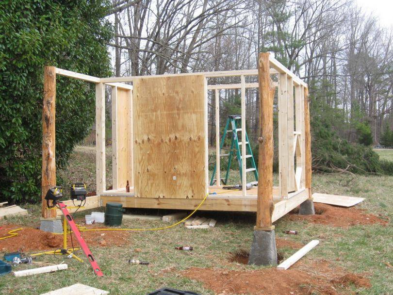 Этот сарай имеет небольшое крыльцо-веранду, потому на требуемом расстоянии установлен поперечный брус. А него будет опираться стенка. Под него предварительно сделаны и столбики.