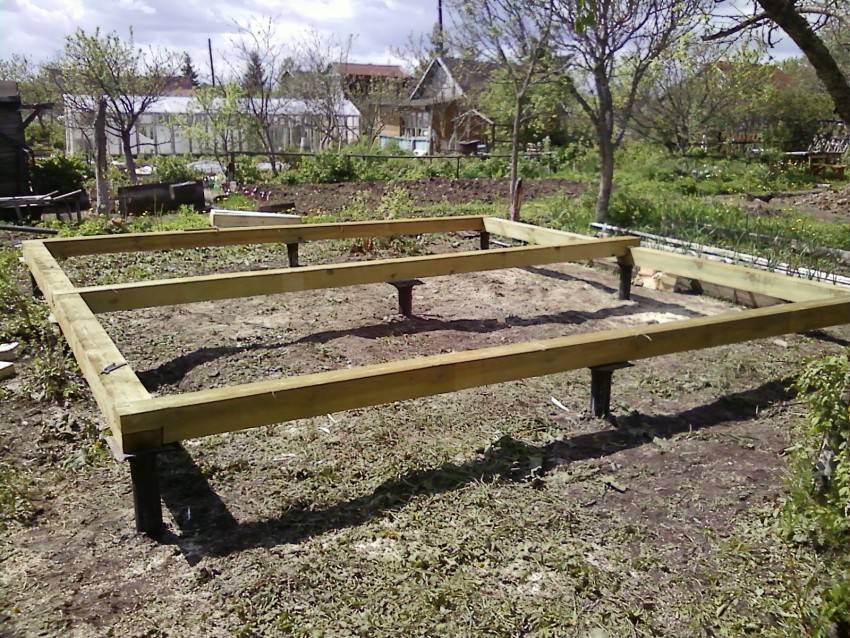 Постройка на грунте приемлема только для времянок, поскольку нижние части ограждения быстро начинают гнить от соприкосновения с влажным грунтом. Такие строения приемлемы только для скальных и песчаных почв с очень низким уровнем грунтовых вод. Для всех других случаев лучше использовать фундамент столбчатого типа (монолит, блоки, вкопанные в землю кряжи с подходящей гидроизоляцией). Для особо влажных участков с высоким уровнем грунтовых вод можно устроить фундамент из винтовых свай.