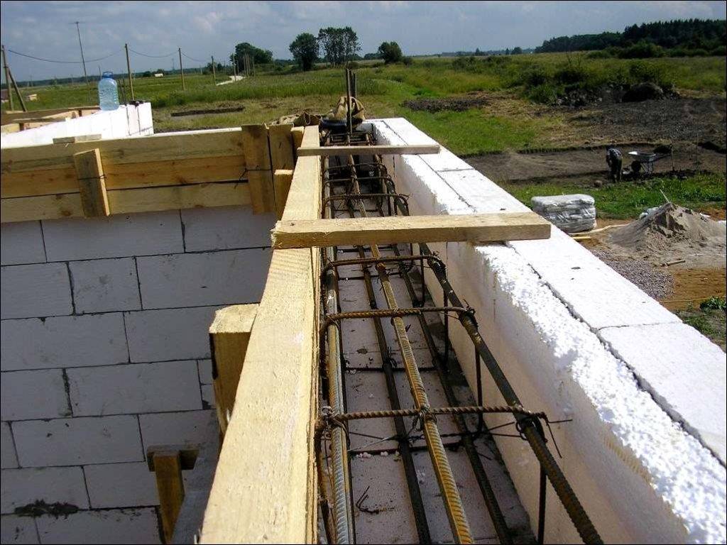 Его монтируют по верхнему ряду в местах опирания балок или плит перекрытия. Арматурный пояс связывает воедино блочные несущие стены и перегородки, равномерно распределяет нагрузку от вышерасположенных конструкций.