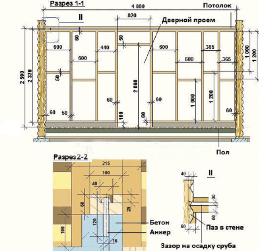 Отличительной особенностью выполнения перегородок в деревянных домах различной конструкции (оцилиндрованное бревно, брус, кругляк), является то, что после сборки дома, происходит усадка строительных элементов, в процессе которой высота внутренних помещений несколько уменьшается. В связи с этим, каркасные перегородки в деревянном доме выполняют через год после его постройки.