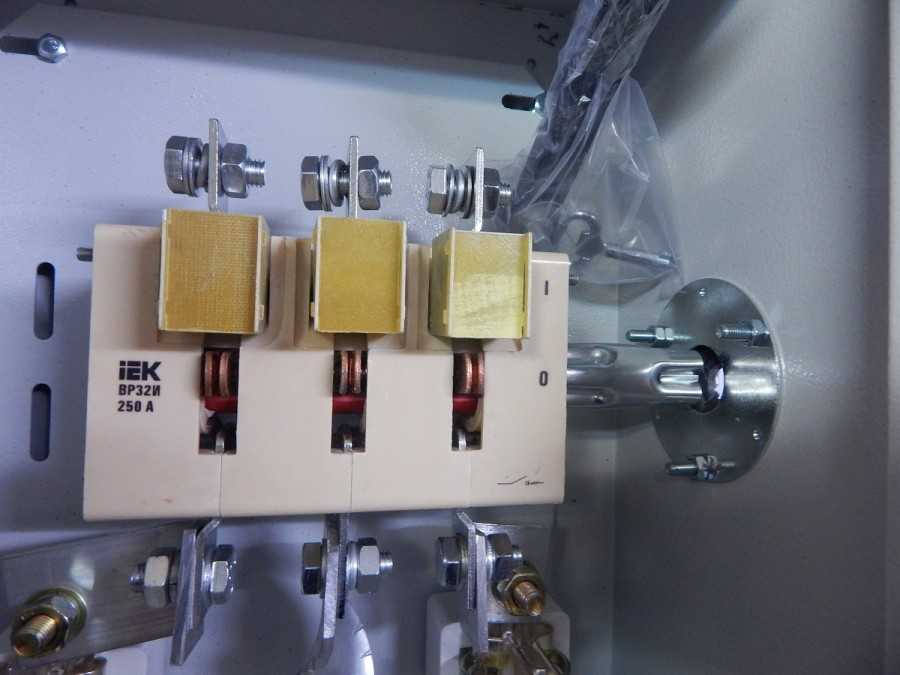 нет, у него два трехфазных входа и один трехфазный выход. У рубильника три положения ручки — в первом положении первая группа фаз подключена к выходу, второе положение — нулевое(выход никкуда не подключен), третье положение — вторая группа фаз подключена к выходу. Для работы — к выходу подключаете провода, которые у вас теперь будут вводными, тот ввод что у вас был — подключаете к первой группе контактов на рубильнике, во второй группе контактов, все контакты соединяете между собой, и к этим контактам подключаете один из выводов генератора, который теперь будет фазой. Второй вывод генератора подключаете к шине нейтрали.