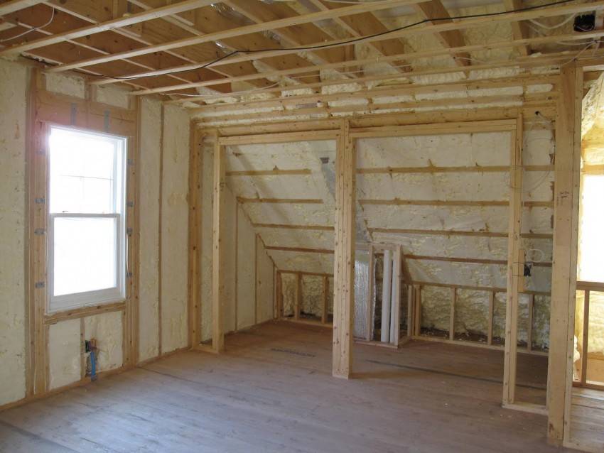 Стандартные чертежи каркасного дома подразумевают постройку здания с несколькими слоями утеплителя. Как правило, их 2: комбинированный, на основе минеральной ваты, и толстый слой пенопласта извне. Однако для некоторых типов климата обшивка пенопластом извне является практически бесполезной. Для сохранения тепла производят утепление дома изнутри.