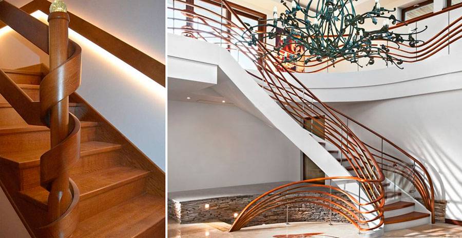 Данная категория считается подвидом вышеприведенного варианта. Такое ограждение выглядит очень элегантно, так как вся работа выполняется вручную. Необязательно заказывать всю конструкцию в таком исполнении, можно остановиться только на балясинах или перилах, а для других элементов выбрать иные материалы. Конечно, такая лестница будет выглядеть эффектно, но ее оформление будет стоить немалых денег. Зато все гости поймут, что статус хозяина тут не позволяет сомневаться в его финансах и вкусах.
