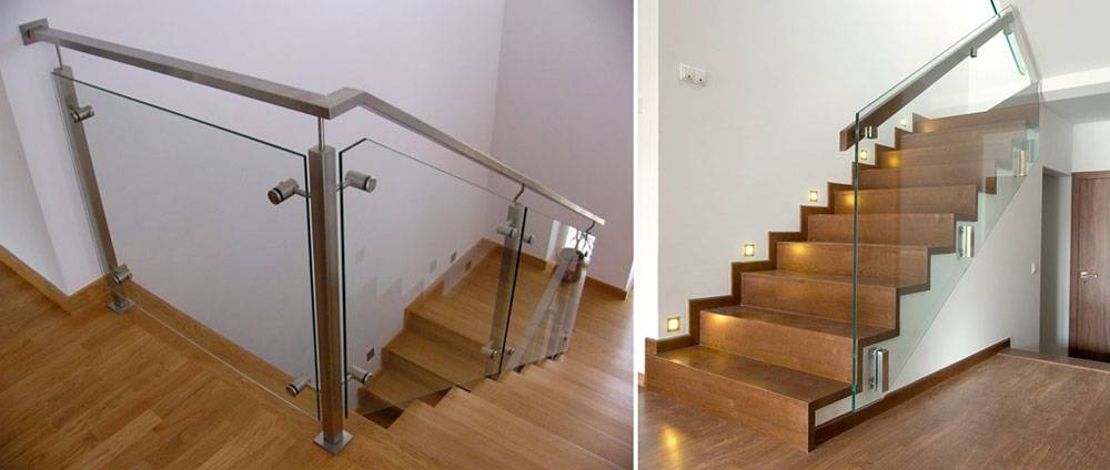 В последнее время ограждения из стекла стало модным использовать и в домашнем интерьере. В этом случае используются пластины плоской или радиусной формы, которые могут по длине равняться от 90 см до 1,5 метров. Средняя толщина такого стекла — 0,6-0,9 см. При желании лестничное ограждение можно оформить и в виде самонесущей панели, ширина которой в среднем 1,5-2 см. В этом случае дизайн не подразумевает наличие несущих стоек. Поручни будут крепиться к стеклянной поверхности посредством кронштейнов из металла. В самой пластине могут быть отверстия, и тогда монтаж будет происходить через них, а не при помощи кронштейнов.