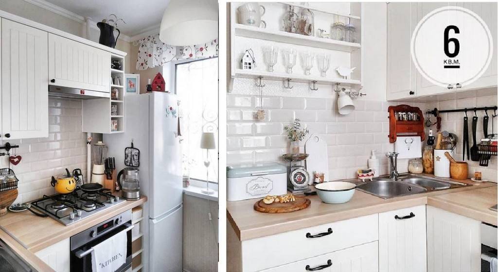 Если имеющаяся в распоряжении площадь всего 5-6 метров, приходится использовать не то что каждый метр, а каждый сантиметр. Потому часто навесные шкафы делают в два ряда — до самого потолка. В нижнем ярусе располагают часто используемые предметы и технику, в верхнем — те, которые применяют редко. Делают шкафы или полки и над холодильником: чего месту пропадать.
