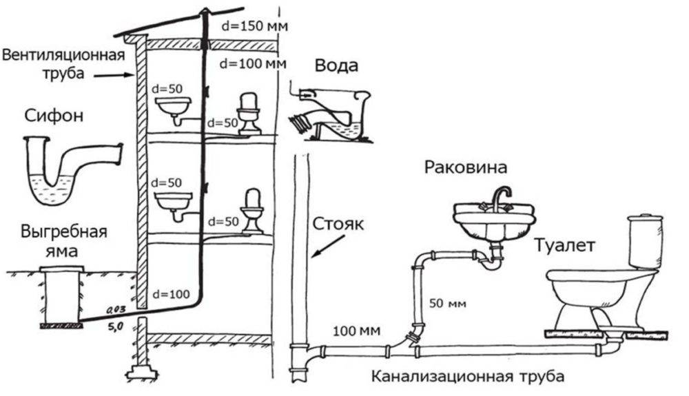 Если у вас дом на несколько этажей, то лучше спроектировать систему канализации с одним стояком. Все выводы от сантехнических приборов (раковин, ванной, биде, стиральной и посудомоечной машинки и прочих) будут последовательно подключаться к трубам и входить в него.