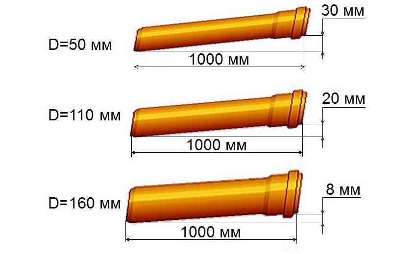 Для труб диаметром 50 мм уклон составляет 3 см на 1 метр длины, для диаметра в 110 мм, значение уменьшается до 2-х см. При имеющейся возможности уклон стоит сделать немного большим.