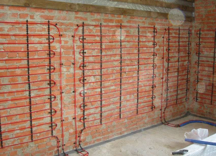 Контур водного пола к стенам крепится по такому же принципу, как и на пол. Если такая система в полу уже установлена, можно врезаться в нее, в противном случае подачу воды придется вести от котла. Трубы лучше всего использовать металлопластиковые, чтобы в местах соединений не создавать смесительные узлы больших размеров. Систему можно закрывать гипсокартонными листами или штукатурным раствором. В обязательном порядке устраивается теплоизоляционный слой, для чего применяют изолон. Закончив монтаж, систему проверяют под давлением, наносят штукатурку, не забыв установить термодатчик и армирующую сетку, предохраняющую стены от появления трещин.