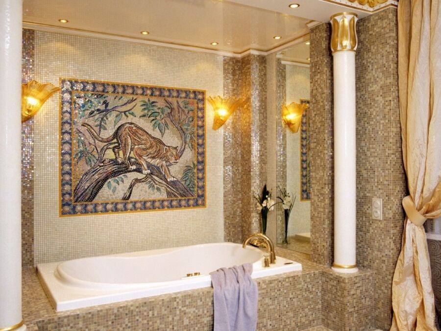 Другого материала, кроме мозаики, который бы идеально отвечал условиям нахождения в ванной комнате и, одновременно, словно обтекал бы изогнутую поверхность, нет. Она не просто обеспечивает заурядную отделку, а становится в руках мастера настоящим украшением.