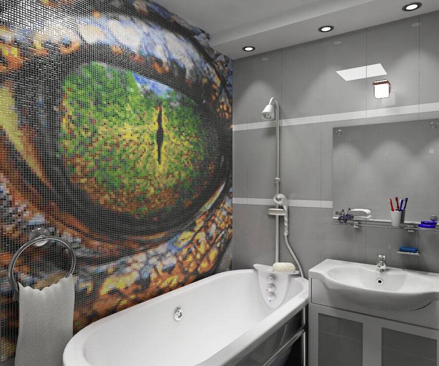 Мозаичная картинка на стене или на полу ванной комнаты, ниша или полка, украшенная мозаикой, может создать удачный акцент в помещении. Отделка мозаикой вполне подойдет как для помещения больших размеров, так и малогабаритной ванной комнаты или кухни. Ее можно сочетать с оформлением из других материалов.