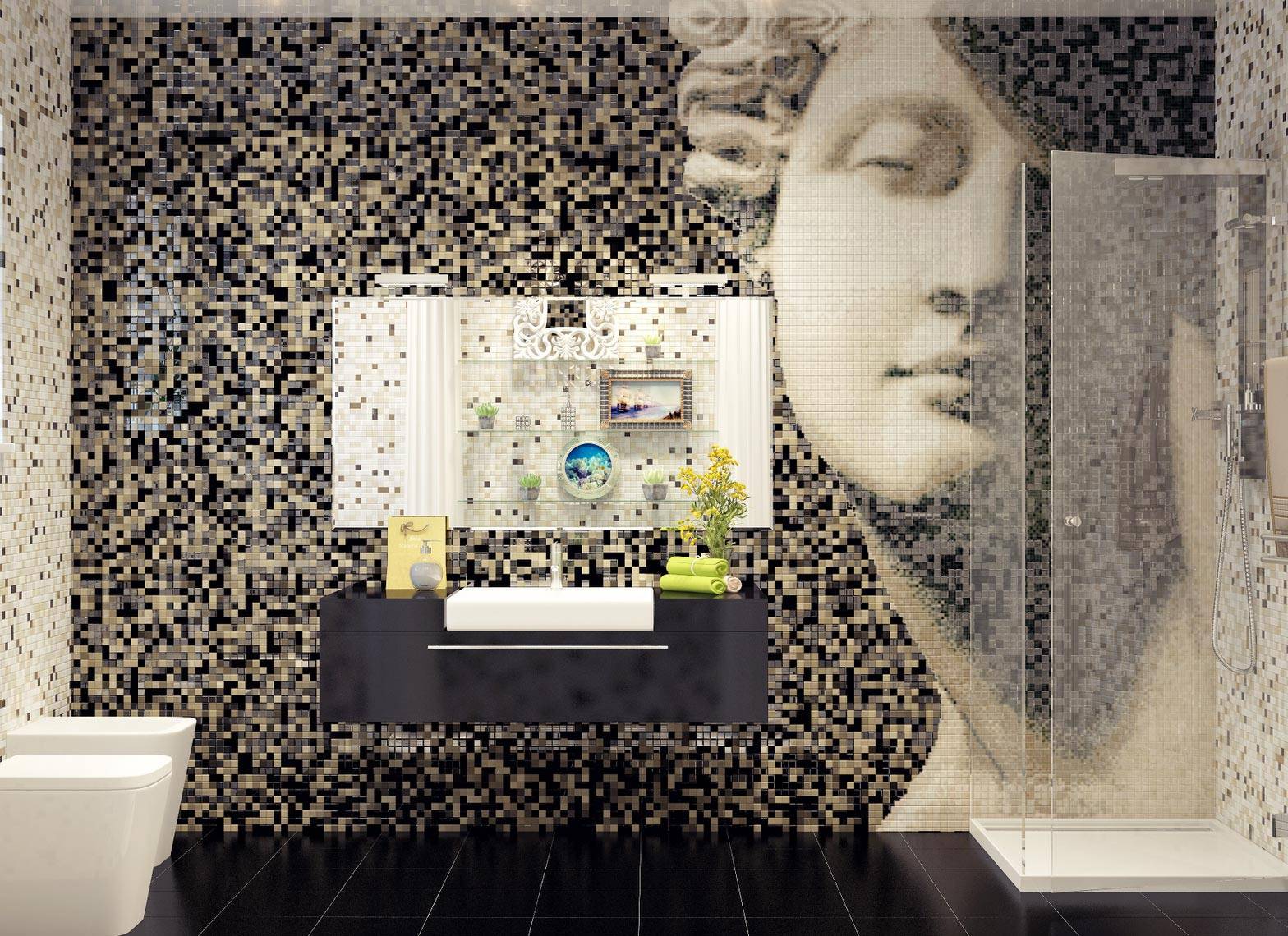 Несмотря на выпуклость, вогнутость или иную искривленность поверхности, её можно идеально облицевать, используя элементы мозаики. Отделать можно не только стены, пол, но и ниши, углубления, а также сами предметы сантехники – раковины и ванны.