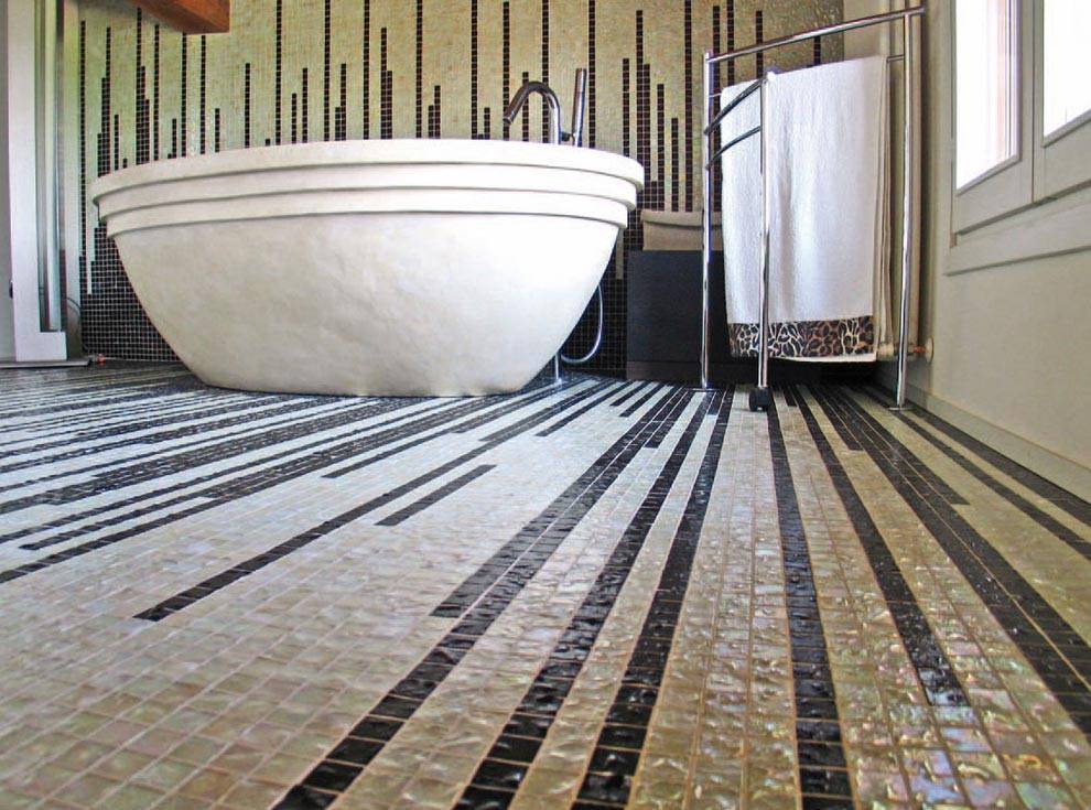 При помощи плитки мозаики на полу можно создать подобие ковра и украсить поверхность красочными узорами. На такой полбудет приятно наступать не только в обуви, но и босиком. Мозаикой оформляется как вся поверхность, используя спокойные цвета, или отдельная зона: например, участок около ванной или раковины на манер резинового коврика.