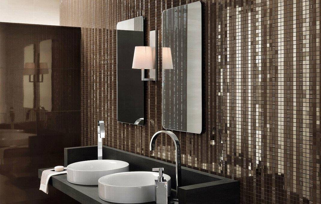 Чтобы в небольшом помещении сформировать визуально отдельные зоны, можно декорировать мозаикой зеркало, расположенное напротив входа. При этом стена с одной стороны от зеркала декорируется светлыми оттенками, а с другой более темными.