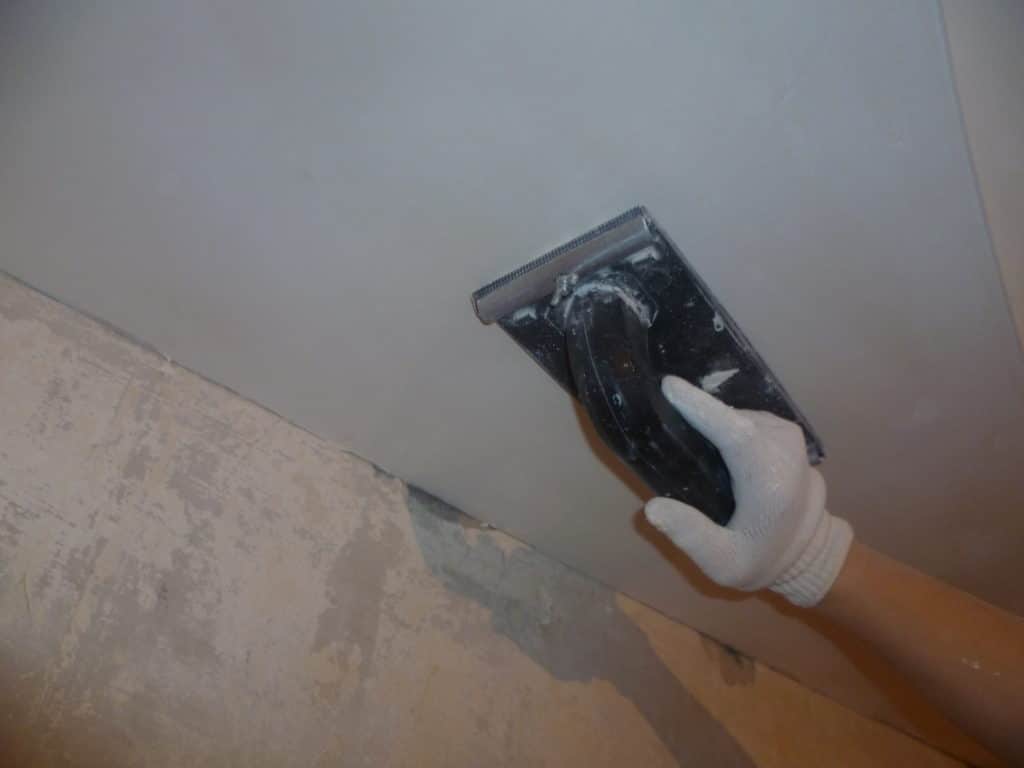 Когда потолок полностью высохнет (время высыхания шпатлевки смотрите в инструкции к ней) можно пройтись мелкой наждачной бумагой, чтобы устранить малейшие неровности, получая идеально гладкую поверхность.