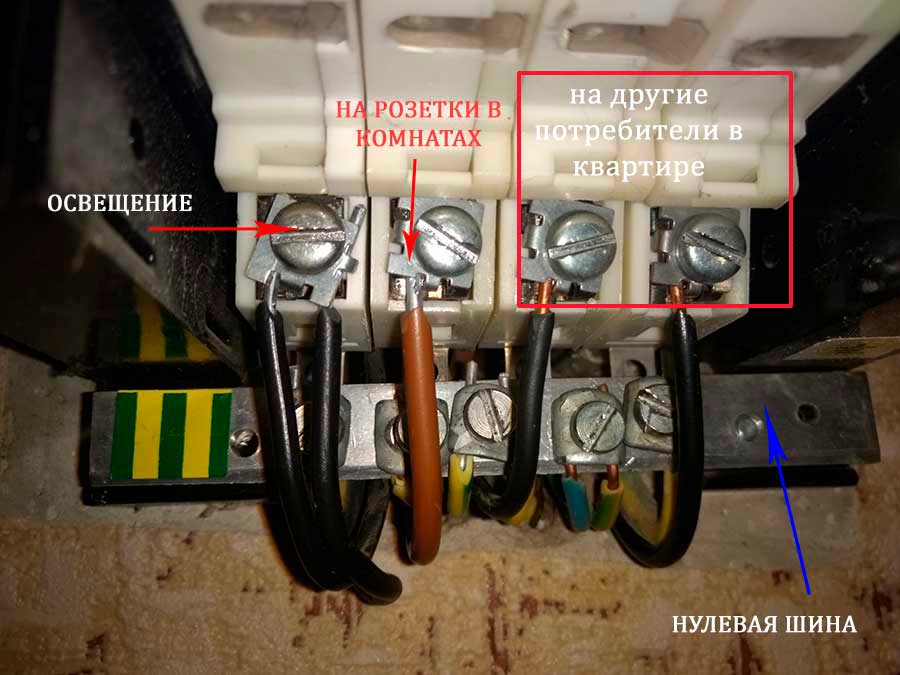 Т.е. в реальности мы проложили новую нулевую линию вместо той, которая была в стене, а, чтобы не вести ее через всю квартиру к щитку, была найдена ближайшая работающая нулевая шина, в нашем случае в распредкоробке.
