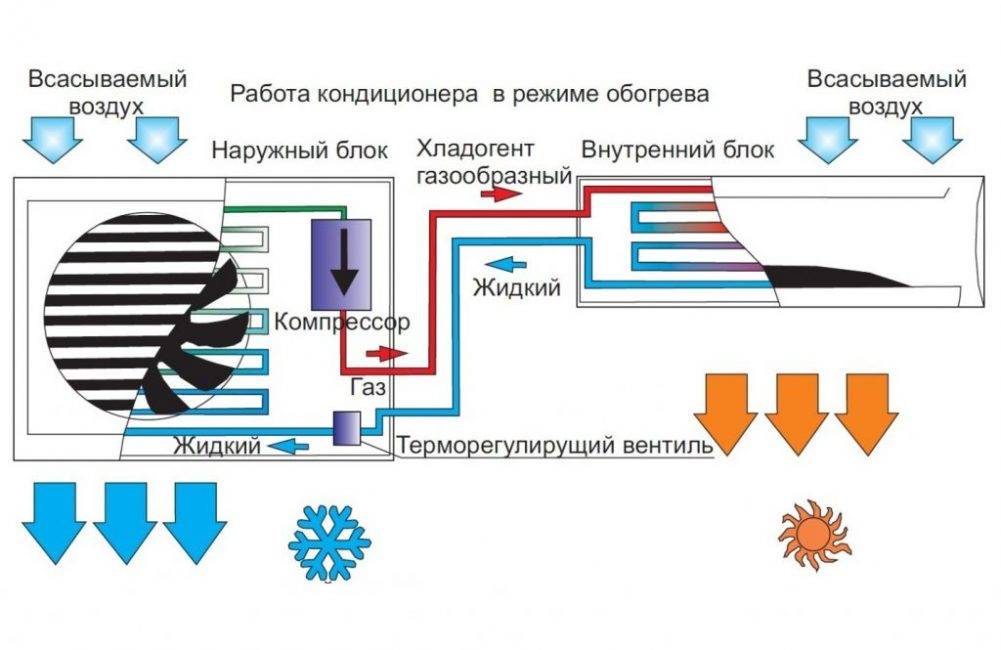 Для работы в режиме обогрева агрегат должен быть снабжен четырехходовым клапаном, с помощью которого меняется направление движения хладагента в системе. Принцип функционирования компрессора при нагреве тот же, что и при охлаждении, но последовательность этапов преобразования хладагента обратная.