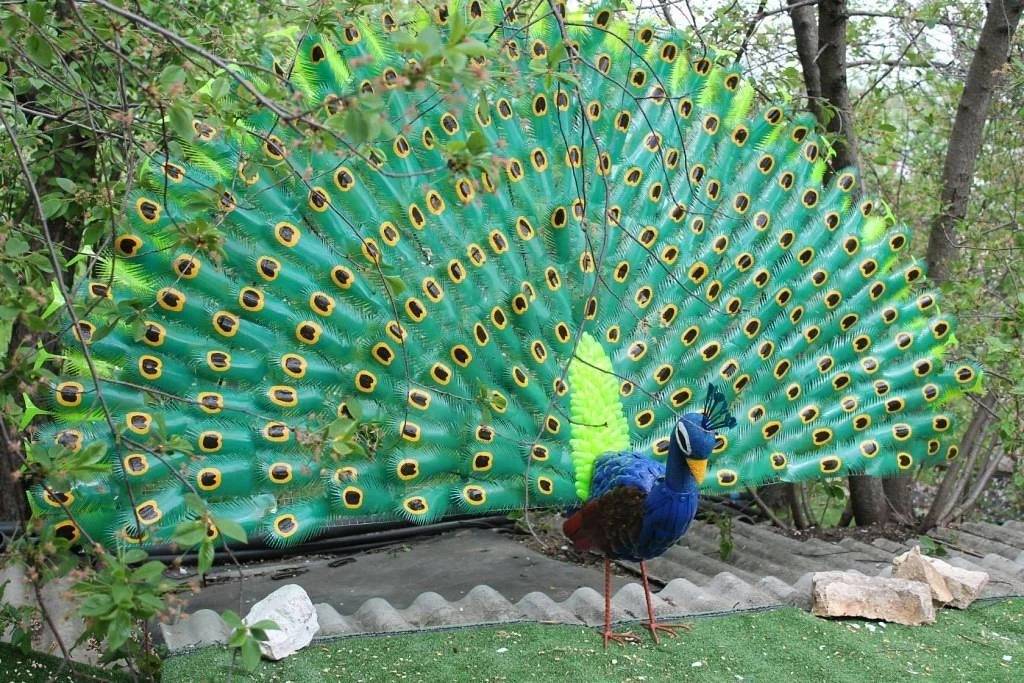 Для создания садового декора полезно знать, как сделать лебедя из пластиковых бутылок. Из емкостей подходящего цвета и размера формируют тело птицы. Потом надевают несколько обрезанных горлышек одно на другое, чтобы сделать изогнутую шею лебедя. Ее закрепляют на туловище. Оперение птицы делают из пластика, нарезанного длинными полосками. Для правдоподобности по краям каждой полоски делают бахрому. Все элементы соединяют при помощи клея. Учитывая рекомендации по изготовлению лебедя, несложно догадаться, как сделать павлина из пластиковых бутылок.