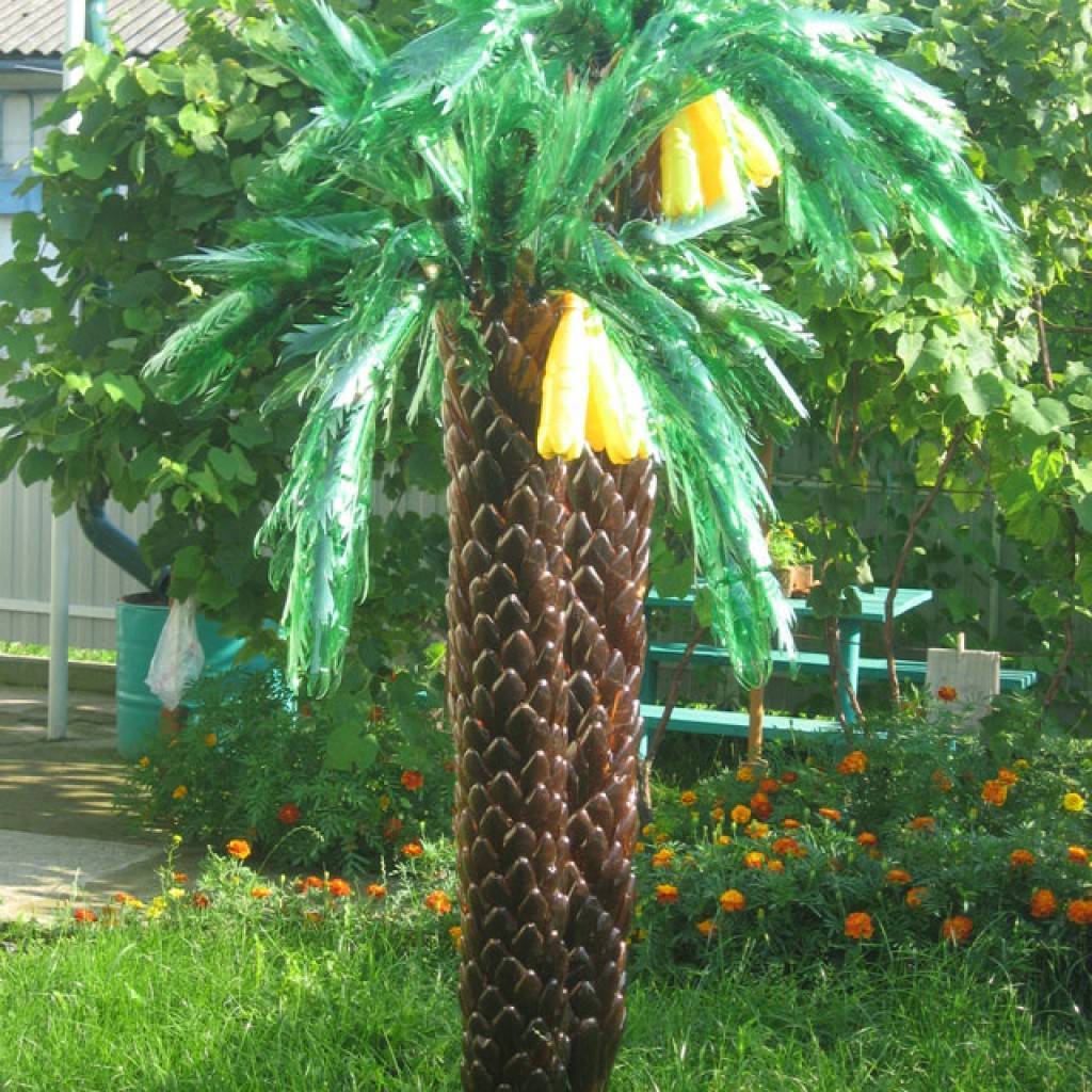 Привнести на свой дачный участок небольшой тропический оттенок очень просто. Для изготовления пальмы понадобятся пластиковые бутылки коричневого и зеленого цветов, немного времени и усилий. Существует несколько вариантов создания такой пластиковой пальмы, они отличаются по трудоемкости работ и тем, насколько готовый результат похож на настоящую пальму. Остановимся на одном из лучших способов.