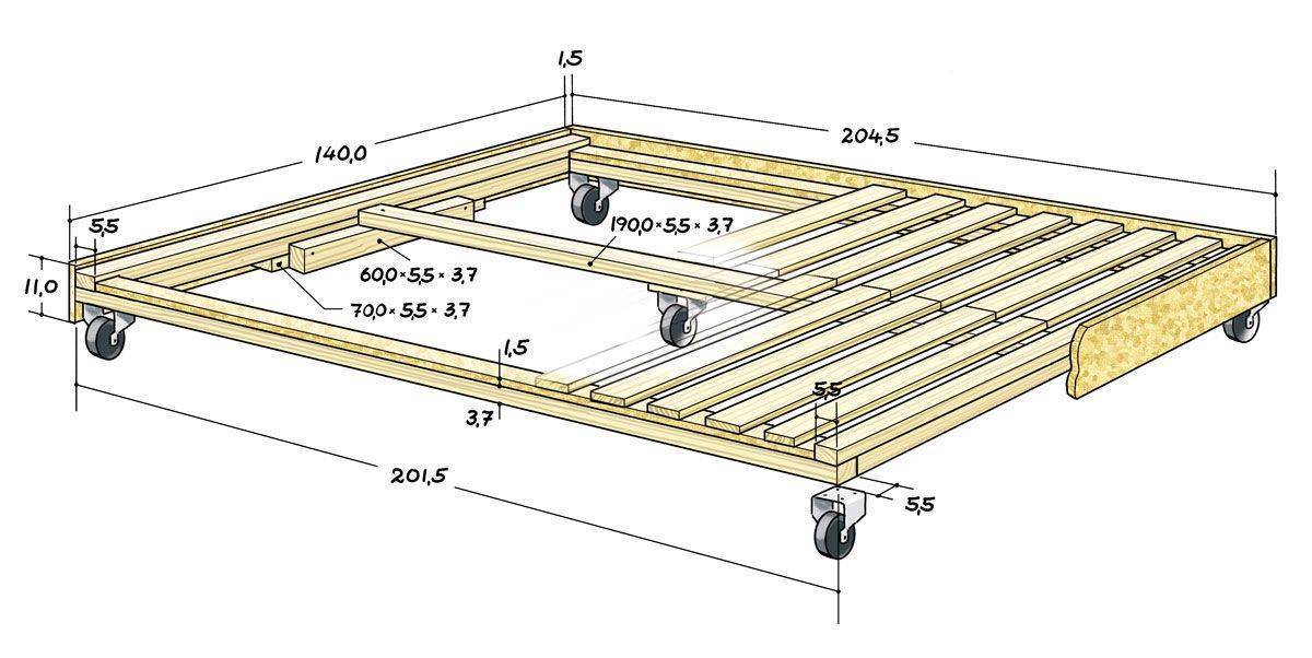 Изготовить чертежи и схемы, выбрать размеры, создать проекты и эскизы кровати-подиума, можно своими руками. Чтобы сделать конструкцию, выбирают материалы, инструменты, собирают каркас, обшивают его, делают выкатную полку-кроватку. Для стандартной комнаты площадью не менее 15 кв. м., высотой потолка 2,5-2,9 метра, высота подиума составляет 45-55 см. Спальное место в описываемой модели выкатывается на колесиках-роликах.