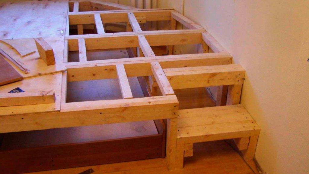 Вначале собирается опорная рама из двух параллельно расположенных прямоугольников. Нижний размещают на уровне пола, а верхний – на линии высоты изделия. Между ними по углам и на некотором расстоянии друг от друга устанавливают стойки из брусьев 5х5 см длиной, равной высоте подиума. Прикручивать нижний ряд необходимо к полу, верхний – к стене, а свободные стороны будут удерживаться за счет стоек.