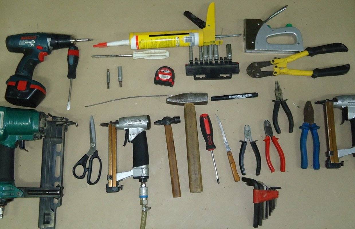Из инструментов для работы потребуется электролобзик, электропила или ножовка, перфоратор, шуруповерт, фрезерная и шлифовальная машинка, отвертка, металлическая рулетка, карандаш, линейка, кисточка, валик.