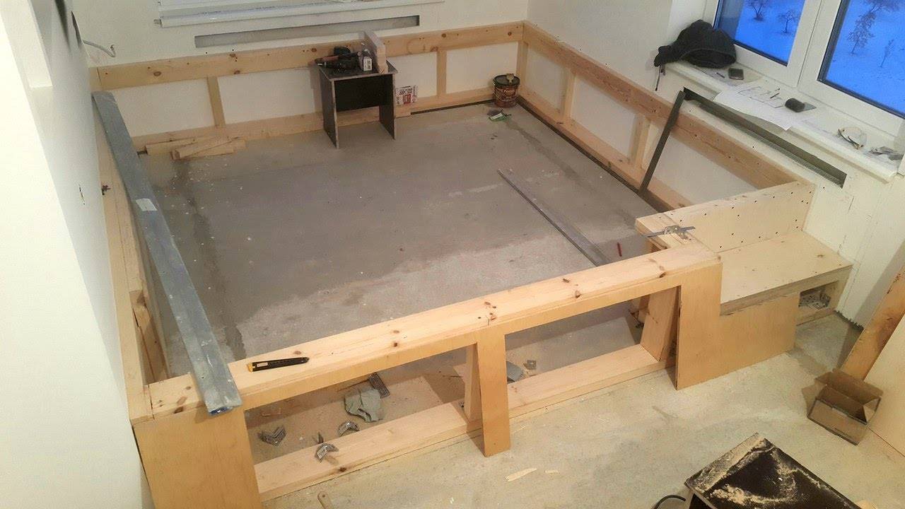 Для каркаса можно использовать дерево, ДСП либо МДФ, хотя оптимальным вариантом является металл. Хорошим решением будет залить стяжку, сделанную на основе бетона, под подиум