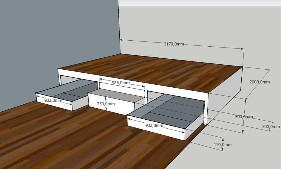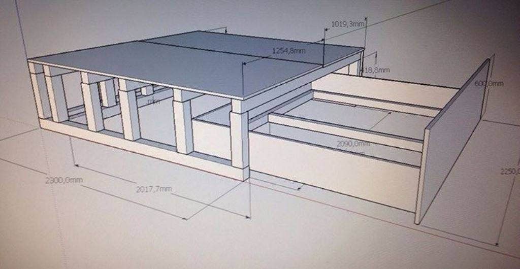 На начальном этапе необходимо подготовить чертеж конструкции, а также рассчитать материал. Чаще всего длина пьедестала – это ширина помещения. Наименьшая ширина должна соответствовать ширине спального места.