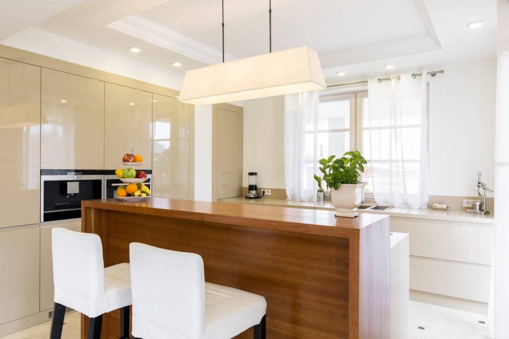 Еще одна идея — использовать навесные светильники, которые мы уже упоминали. Они подходят для выделения любых мест, будь то обеденная зона или место работы с продуктами.
