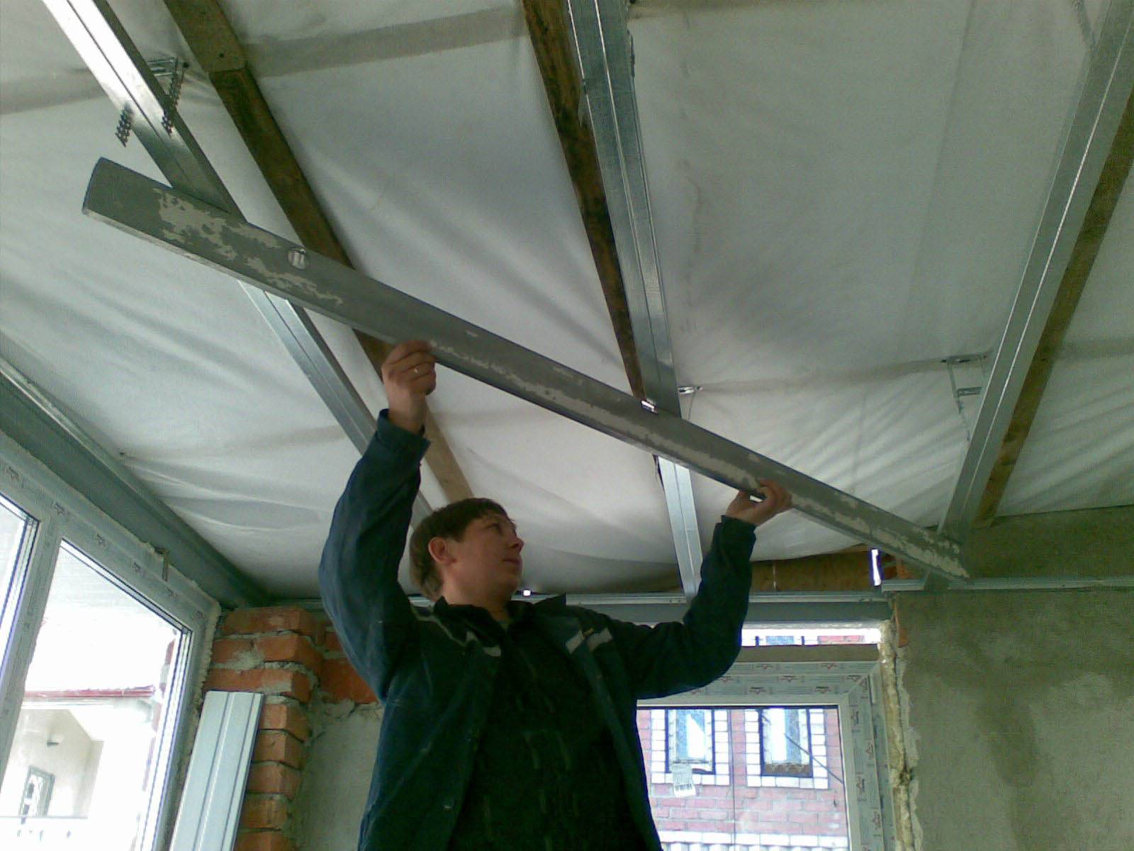 Крепят потолочные направляющие. Нарезают ножницами по металлу или болгаркой CD-профиль по ширине комнаты, заводят его в противоположные стартовые направляющие. Для исключения провисания профилей на потолок крепят прямые подвесы – перфорированную металлическую ленту. Крепят их с помощью металлических дюбель-клиньев. Расстояние между потолочными направляющими – 40 см, между подвесами – от 60 см. Направляющие выравнивают с помощью уровня и крепят к подвесам саморезами по металлу. Концы подвесов загибают или обрезают. Если необходима укладка звукоизоляции – ее можно закрепить концами подвесов.