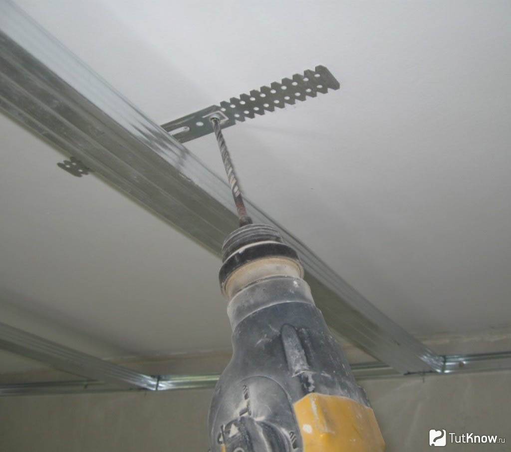 - Высверливают в черновом потолке отверстия под дюбели, крепят подвесы. Отгибают перфорированные полочки каждого так, чтобы получилась буква «П».