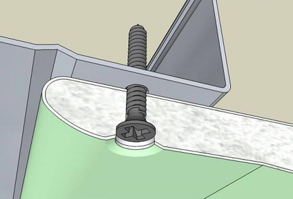 - Первая точка крепления листа к металлопрофилю должна находиться не дольше 2-х см от края полотна.