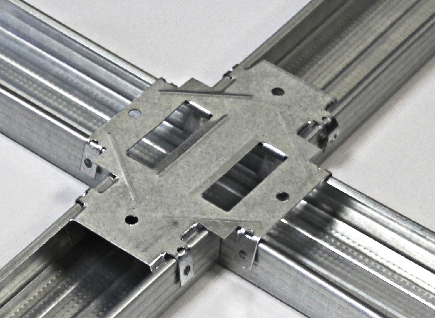 П-образные подвесы, которыми несущие крепятся к потолку. Понадобятся и соединители-«крабы» для крепления поперечин, а в случае больших перепадов основания и нехватки из-за этого длины П-образных подвесов понадобятся быстроподвесы. Если несущий профиль короче меньшей стены, его доращивают при помощи продольных соединителей.