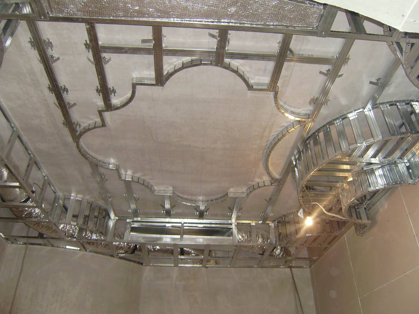 Каркас двухуровневого потолка из гипсокартона собирают поэтапно.