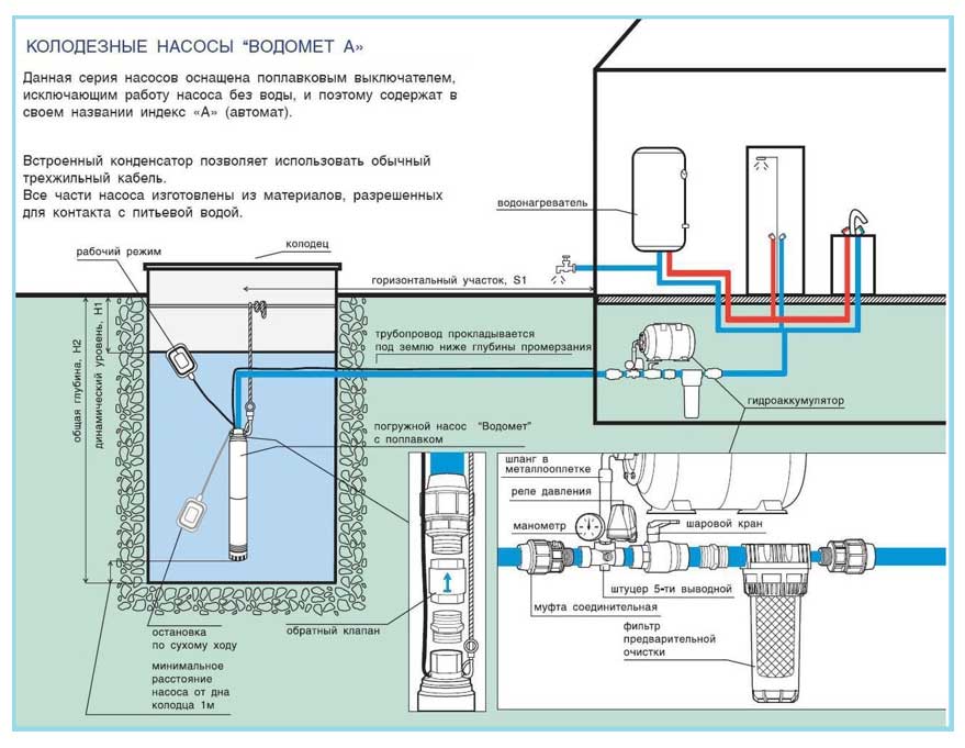 Для водозабора из колодцев при расстоянии водного зеркала от поверхности менее 9 метров широко применяют поверхностные водопроводные насосы или насосные станции центробежного принципа действия с автоматикой, отличающиеся бюджетной стоимостью и простотой эксплуатации. Если статический уровень источника водоснабжения больше 9 метров, или он опускается при водозаборе на большую глубину (динамический уровень), приходится использовать в колодце погружной электронасос.