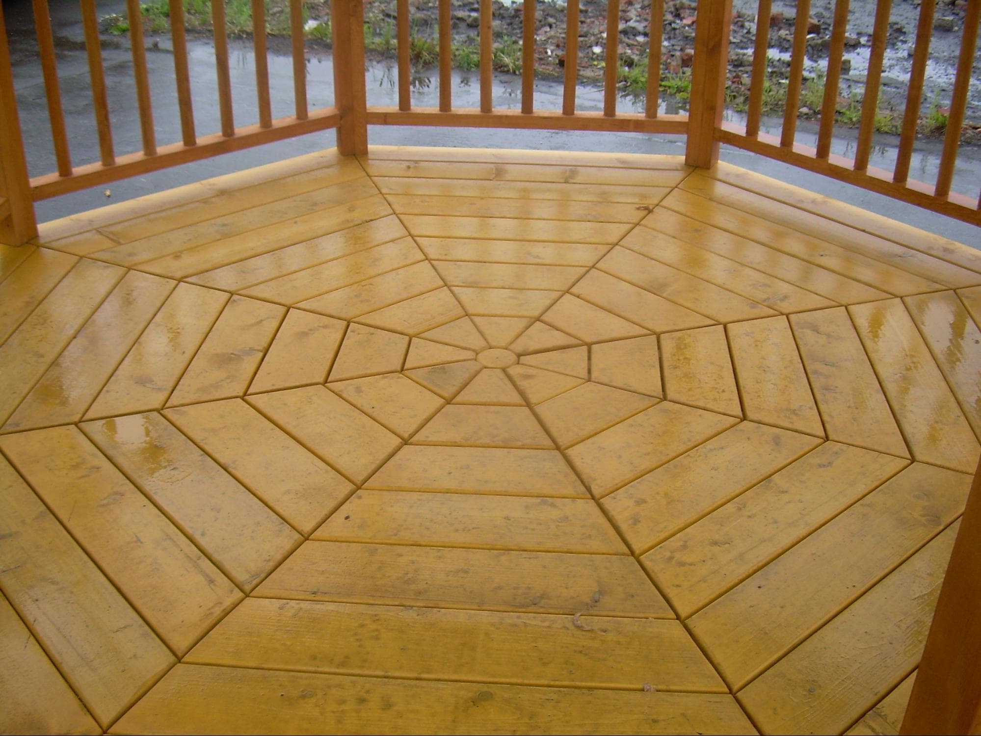 Если беседка будет малопроветриваемой, то есть у нее будут стены, но не будет достаточно больших окон, то следует подумать о том, что полы должны быть влагоустойчивыми. Иначе внутри постоянно будет сырость, а со временем могут завестись плесень и грибок. Плюс ко всему деревянные полы в таком сооружении будут подвержены порче.