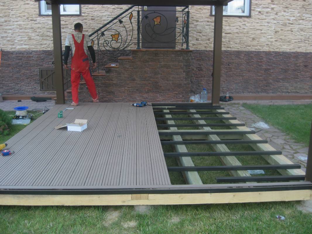 - Террасная или палубная доска (декинг). Этот материал тоже состоит из дерева, но древесина для его изготовления используется рубленная и перемешанная с полимерным клеем. Благодаря составу террасная доска для беседки не боится влаги и имеет приятную шероховатую поверхность, на которой невозможно поскользнуться;